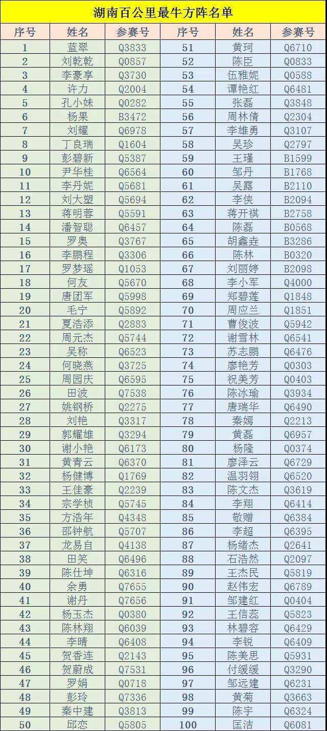 距2021湖南(春季)百公里出征还有不到3天,经过组委会对数百份报名资料的筛选和审核,目前“百公里最牛方阵”的百人名单已新鲜出炉快来看看都是哪些“牛人”吧~
