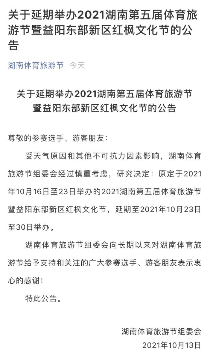 根据《关于延期举办2021湖南第五届体育旅游节暨益阳东部新区红枫文化节的公告》,作为此次节会的子活动之一,原定于2021年10月16日举办的2021益阳走娃少儿健走大赛将延期至2021年10月23日(星期六)举办,相关事项请关注后续公告。