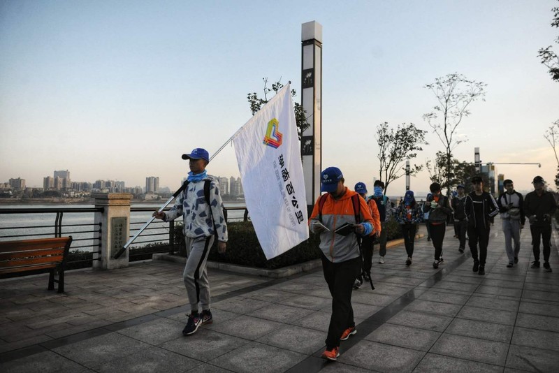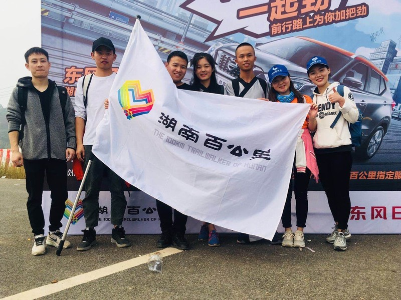我们一行人,一路超越众多毅行者,你说我们的目标是超越眼前的每一面旗,做最骄傲的旗手。