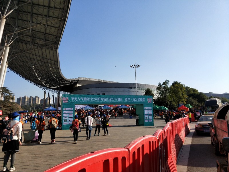跟随着人群,我的百里毅行也就正式拉开了帷幕。走在路上,沿途欣赏路上的风景,时不时地拿出手机照相合影留念。我跟同学一边走着,一边说着我们的趣事。第一天的午饭是在湘潭地界吃的,人很多,但是志愿者们的服务热情丝毫没有减退一份,始终坚守在本职岗位上。下午的路很漫长,我们的斗志越来越低,两脚越来越痛,我们走的也越来越艰难。大部分的参赛者都是这样的情况,然而他们也在坚持着,即使路再难走,也要坚持走完。有一些灰心丧气的人已经开始走“捷径”--他们选择乘坐出租车到终点。我跟我同学都无法理解这样的行为,就如同半百终点的标牌上所写“坐车过来的,你好意思拿证书吗?”举办这样活动的意义不仅仅是为了拿个证书,关键是为了挑战自我,完善自我,提升生命的价值。