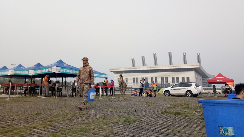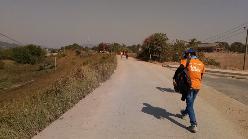 人流渐渐稀少,不知是我们甩了大部队,还是大部队甩了我们。前面零星几人,后面零星几人,周围是广阔却没有车流的马路,只有一面红色的小旗子时隐时现。在似乎没有尽头的道路上走啊走,脚渐渐地疼起来,却不知何时才到下一个城镇。在长路漫漫的寂寥中,视野的右前方忽然出现了一座塔,然后我们看到了一个军人——“欢迎来到第三个签到点!”