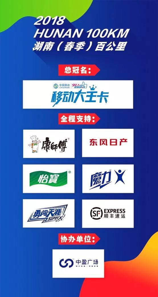 2018湖南(春季)百公里由共青团湖南省委、湖南省体育局、湖南日报社指导,由华声在线股份有限公司主办,湖南华声户外运动有限公司承办,中国移动通信集团湖南有限公司总冠名,中盈广场协办,得到了康师傅控股方便面事业湖南行销公司、华润怡宝饮料(中国)有限公司、华润雪花啤酒(湖南)有限公司、东风日产乘用车公司全境越野SUV途达、湖南顺丰速运有限公司等企业的大力支持。
