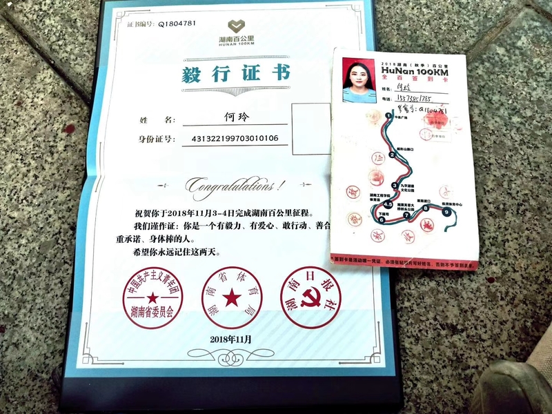 在第二签的时候,工作人员问我怎么第一签没有签?然后完了告诉我今年的百公里跟以往不同,只要有一签没签到,走到终点也没有。当时直接蒙圈就哭了,负责盖章的工作人员说你要是放弃的话我帮你联系随行的车。当时心里有多不甘心,走了将近四个小时到的第二签,就因为我第一签漏签难道我就要放弃吗?一起的小伙伴们问我怎么办?还继续走吗?当时想过要放弃,想着反正走到终点也拿不到证书,拿不到奖牌还不如回家好好休息上班挣钱呢!!最终,发誓这次百公里不坐车的执念胜过负心态,擦干眼泪对小伙伴们说:我跟你们一起走,今年拿不到证书跟奖牌大不了我明年再来个三刷。