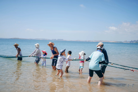 抵达海边,老师讲解拉网捕鱼的基本知识和安全注意事项。分组领取拉网工具。老师示范拉网的基本动作和技巧,学生们开始练习。各小组在渔民的指导下,开始拉网捕鱼。收网后,观察和认识捕到的海洋生物。