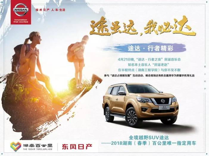 2018湖南(春季)百公里今日开拔,作为中国规模最大、影响力最强的长距离徒步活动,湖南百公里到今年已走过11个年头。和往年相比,2018湖南(春季)百公里规模再创新高,内容更加丰富,不仅如此,完成半程赛的毅行者还有机会在2018湖南百公里之夜既东风日产“途达行者之夜”民谣音乐会现场,赢取由湖南百公里合作伙伴东风日产提供的终极大奖——价值近2000元的华为荣耀手机一台。