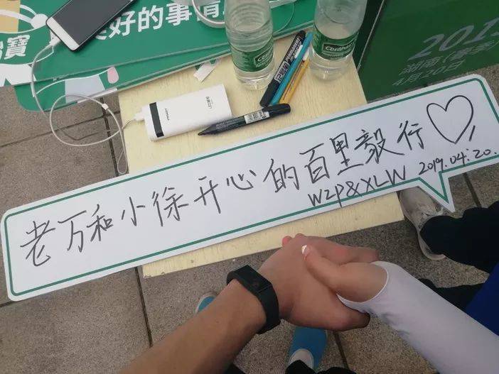 老万和小徐一起领了一块标语牌写上“老万和小徐开心的湖南百公里徒步活动”,两个人在公园里走动了一会儿,等到两个闺蜜来的时候就送她们上大巴回去了。