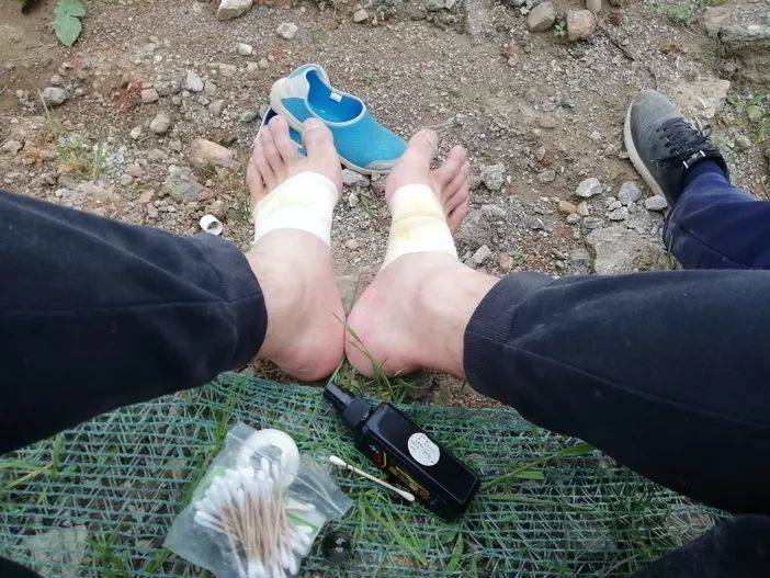 那条石子路简直就永远没有尽头,第二天的老万感觉双腿就像灌了铅一样,每挥动一下都要用尽全身力气,双脚都起了水泡还不小心碰破了,每一步都是痛苦的,那么长的石子路让我有些绝望。用自黏布简单的包扎了一下脚底板,并且喷洒了消毒的碘液和云南白药,但还是不自觉的放慢脚步向前走,路上还目睹共青团团旗和百公里活动旗的前进,致以崇高敬意。到后面已不顾形象,心中只有一个念头:坚持就是胜利,继续往前走,一定要走到底,拼了命也要走!