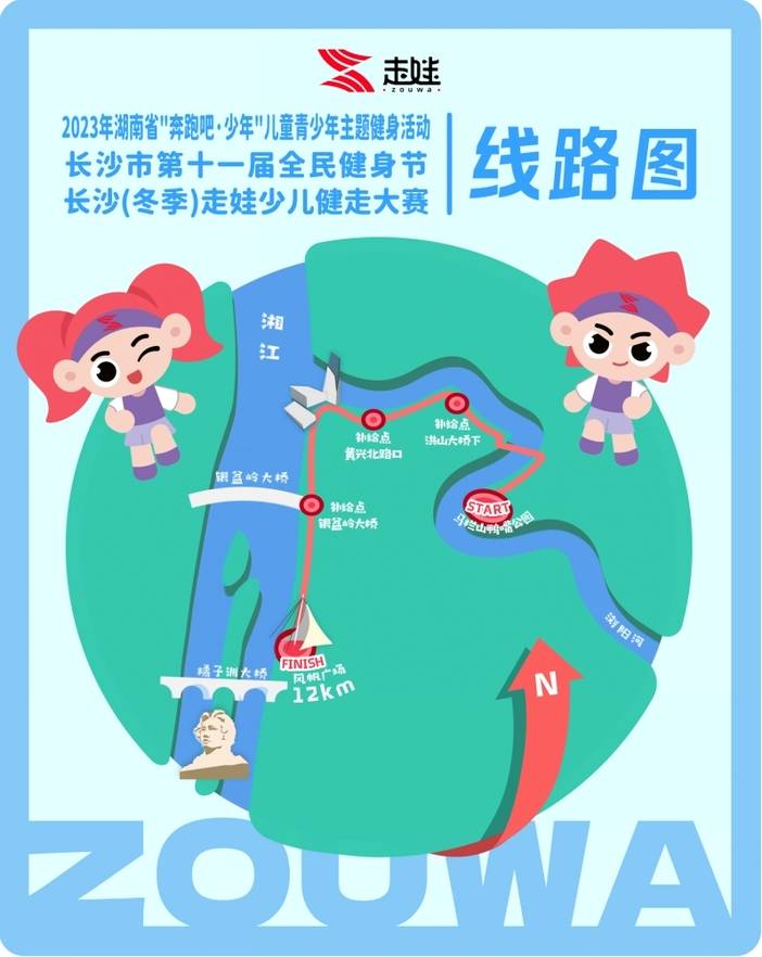 马栏山鸭嘴公园(起点0km)——浏阳河风光带健身步道——三一大道浏阳河大桥(过桥2.1km)——浏阳河南岸风光带——洪山大桥下(补给点3.5km)——车站北路浏阳河大桥(下穿桥下4.7KM))——芙蓉北路浏阳河大桥(下穿桥下6.5km,)——黄兴北路口(补给点7km)——滨江文化园——银盆岭大桥(补给点10kmm)——风帆广场(终点12km)。