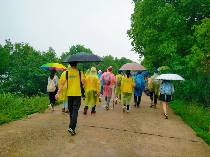春风百里不及大雨一场。大伙儿都有点担心的雨还是来了,给我们以爽快接近终点。起初,我们行走在最后一座桥的中间路段,小雨还不撑伞,就当享受。我们下了桥雨就不等我们了,越下越大,雨衣雨靴雨伞都上了战场,与我们一同作战。而我和我的小伙伴只有雨伞,我们也勇往直前,我们互给笑容以力量,大步向前。雨愈来愈猛,我的思绪也愈来愈浓。我竟赞叹大自然的馈赠近乎完美,何不再来闪电与雷声。这一古怪想法大概是雨淋出来的,最终大自然毫无保留的将一切给予我们在路上的行走着的人,也合了我的思绪——完美!我们这一路走来经历了阳光、风雨、闪电雷,这是收获来自大自然的洗礼,我心中满怀敬畏,溢于言表。久雨停后是没有彩虹的,有的是朦胧如诗的湘江映像在你眼前,新鲜的空气似乎注入了你我的血液,被雨淋透的鞋里装着的脚丫似乎重新活过,有一同的行人跑了起来,我们赞许的目光里带着些许疑问。最终我和我的小伙伴眼神一拍即合也奔跑了起来,这才知道其中的奥秘。原来原来换一种姿势行走,不是要赢得别人的夸赞,是这一种新鲜的尝试解除了身心的疲惫。