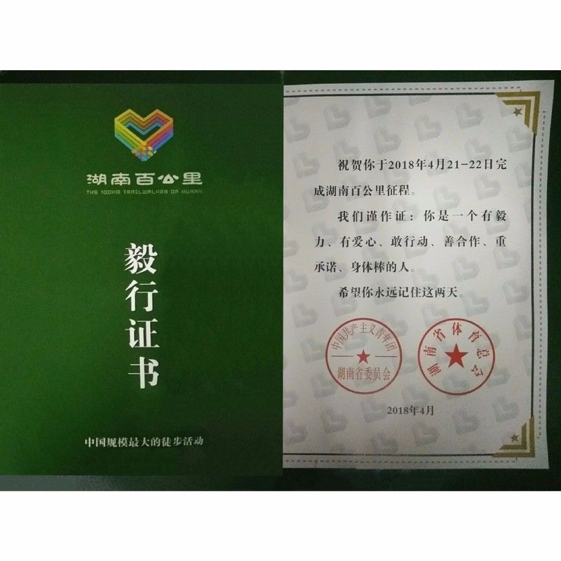 选择奔跑的我们,如梦般地到达终点。“祝贺你于2018年4月21日——22日完成湖南百公里征程。你是一个有毅力、有爱心、敢行动、善合作、重承诺、身体棒的人。希望你永远记住这两天。”哇!我这么棒的吗?不,是我们都很棒!此时此刻,你骄傲吗?当然!因为你走过最长的路不再是“套路”,是百里毅行啊!所以说,你怎么可能会忘记这两天呢?是的,我们不会辜负此“希望”,我们会永远记住这两天!因为走过的路脚会记得,血热过的灵魂也不会忘记。这一次,我们用行动证明了:人生没有白走的路,每一步都算数!